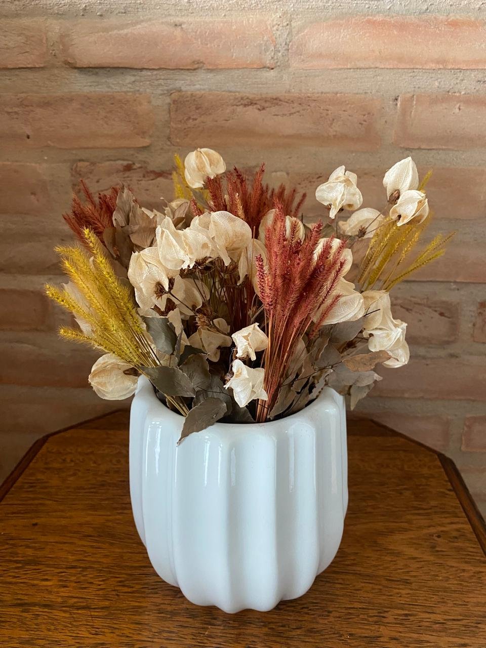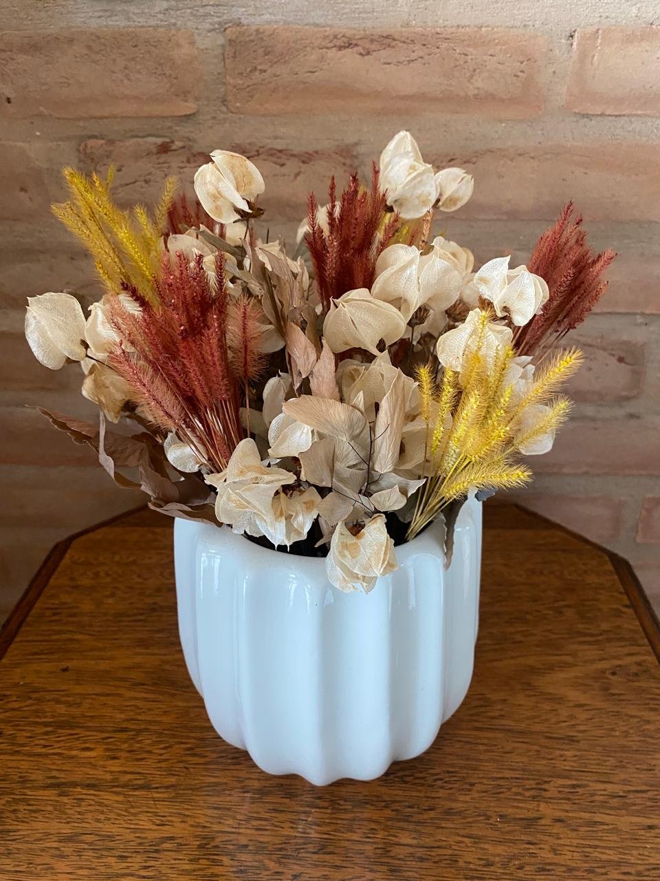 O Arranjo de Flores Secas é feito à mão com flores cuidadosamente selecionadas e preservadas para oferecer beleza e durabilidade. Ideal para decorar sua sala, hall de entrada ou mesa de jantar, ele traz um toque natural e sofisticado ao ambiente. Cada peça é única e produzida com atenção aos detalhes, combinando textura, cor e harmonia para complementar sua decoração ou surpreender quem você ama.